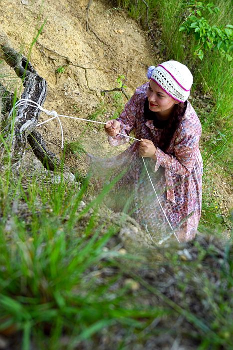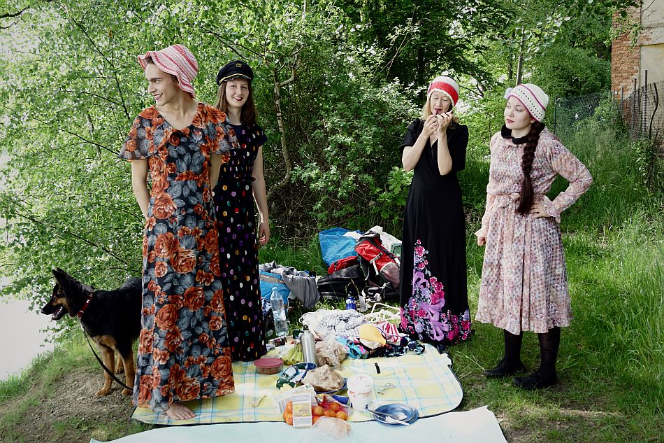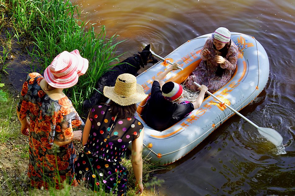 Nachdem wir uns den Bauch vollgefressen haben, probieren wir logischerweise (nein, nicht logischerweise) die Kleider an, die Nora aus dem čojč-Fundus mitgeschleppt hat – und auf wundersame Weise passen sie allen auf Anhieb! Jetzt noch Lippenstift… ja, auch für Lou! Daraufhin folgt (natürlich jetzt, nachdem wir uns schick gemacht haben) die harte Arbeit: das Schlauchboot aufpumpen. Mit vereinten Kräften schaffen wir es. Im Boot haben immer nur zwei Leute Platz, also fährt Nora mit Esterka zur Brücke und setzt sie ab. Esterkas Hund Freya ist davon nicht so begeistert. Sie traut sich nicht ins Wasser und bellt nach ihr. Aber sie kommt schon klar und Lou und ich fahren auch zur Brücke, während Nora geschwommen kommt, sie hat keine Lust mehr auf Paddeln. Für unser Vorhaben (eine Schaukel in den Brückenbogen zu hängen) brauchen wir ziemlich lange. Zum Glück bin ich ja dabei und steige die Brücke hoch, im nassen Kleid (meinen Bikini trage ich natürlich nicht) und mit einem verletzten Fuß, weil ich kurz vorher sehr ungeschickt ins Wasser gefallen bin, und werfe das Seil über den Betonträger. Jetzt muss es doch klappen! Irgendwie… die Seile um dieses Brett… und dann hier einen Knoten… Nein, es hat nicht geklappt. Aber wir haben viel gelacht! Am Ende haben wir es immerhin geschafft, dass sich Nora auf die Schaukel stellen konnte und wir sie eingedreht haben.