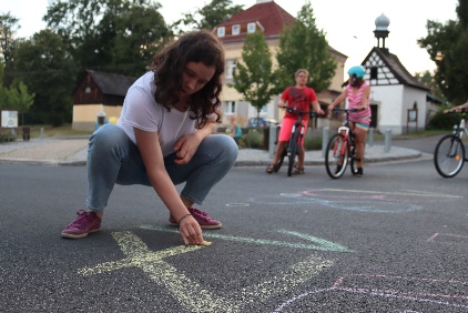 Am Abend sorgen wir für große Aufregung auf dem Dorfplatz, als wir mit bunter Kreide Werbung für die morgige Aufführung auf die Straße malen. Die ansässigen Kinder beginnen zu raten, was wir gerade schreiben. Das Resultat ist ein sehr bunter Hinweis auf unsere Anwesenheit in der Stadt.